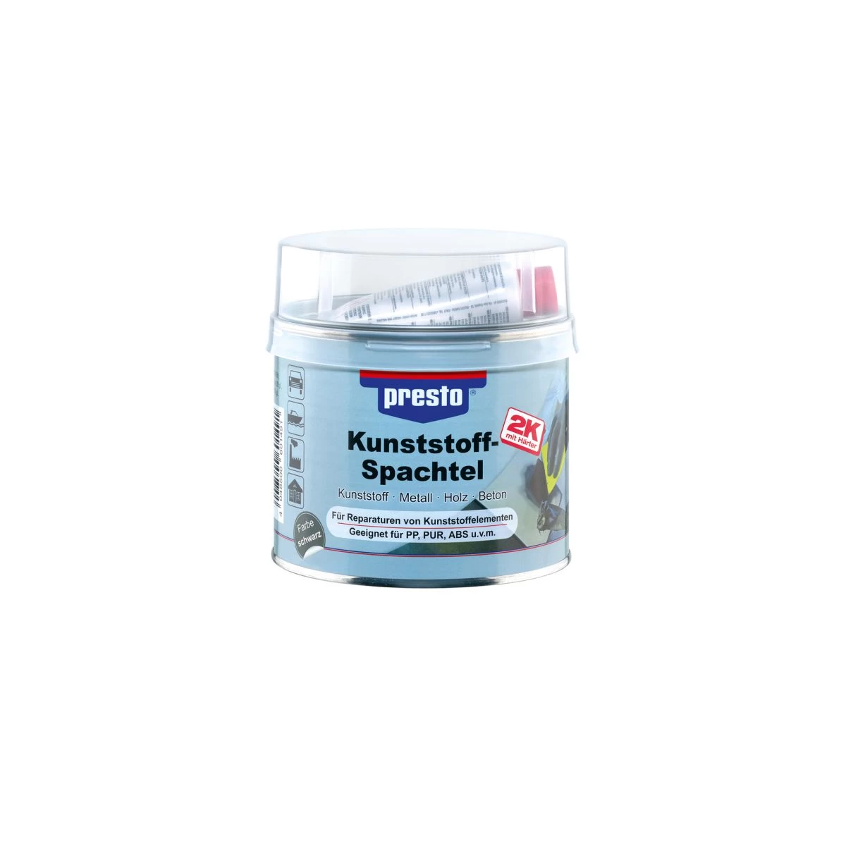presto Kunststoffspachtel ist ein zweikomponentiger, schwarzer Polyesterspachtel, als Mischung eines hochelastischen, aminvorbeschleunigten Polyesterharzes mit verschiedenen mineralischen, umweltfreundlichen Füllstoffen.