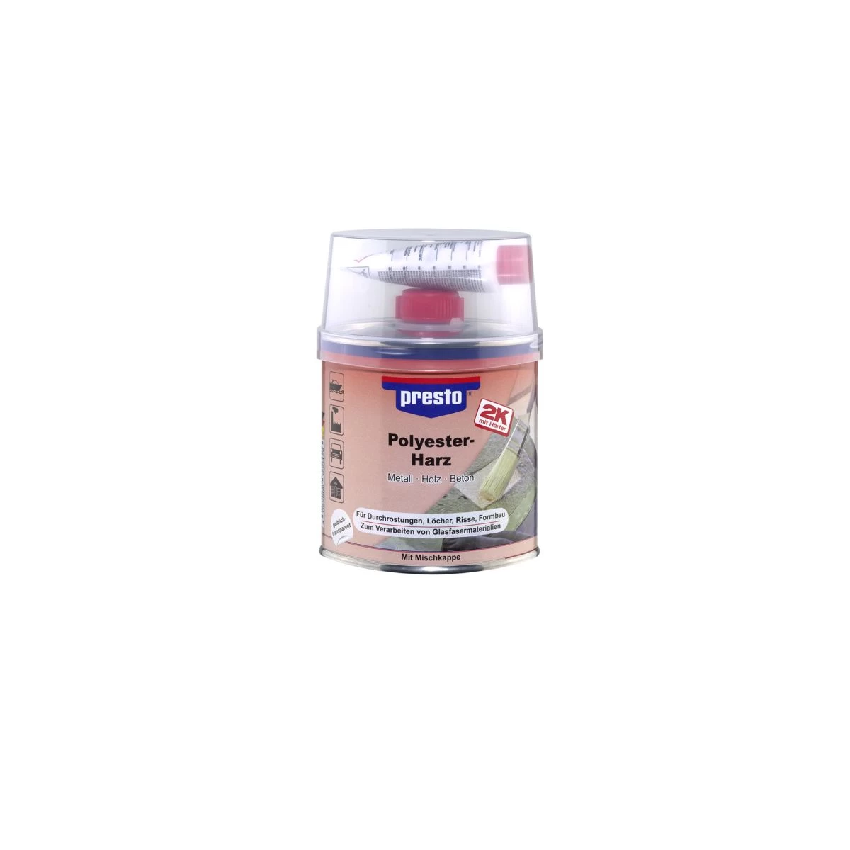 presto Polyesterharz ist ein elastisches, sehr reaktives ungesättigtes Polyesterharz, das praktisch auf jeder Oberfläche angewendet werden kann, insbesondere in Verbindung mit Glasfasergewebe oder Glasfasermatte zum Überbrücken größerer Löcher, Durchrostungen und Schadensstellen. Auf Metall, Holz und Beton, im KFZ-Bereich, Haushalt, Garten (Spritzfaserteiche), Formen- und Modellbau und in anderen industriellen Bereichen sehr gut einsetzbar, zum Beispiel an undichten Leitungen und Rohren, Kesseln, Booten usw.